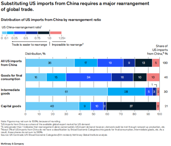 麦肯锡讲述的中枢创新在于提议了营业“重组比率”这一想法,用以臆测一国从特定营业伙伴入口商品后,能否放纵转向其他供应商。具体而言,重组比率界说为某国从特定营业伙伴的入口额占全球其他地区对该居品可用出口总和的比例。该比率越低,标明全球可替代的供应阛阓越大,营业重构的难度越小;反之,则标明重构难度大,以至在某些情况下险些弗成能。