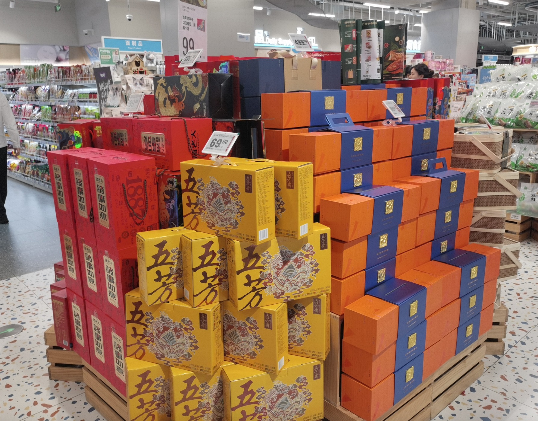 记者造访发现,与往年比较,本年商家格调愈加求实,推出了一大宗价钱在100元以下的礼盒。盒马采购张丽敏默示,本年的粽子礼盒均价较昨年裁汰了3成傍边,主打的礼盒均价在80元傍边,精简的包装让粽子转头食品人道。大润发也相似拿合手住了粽子的难民价,其定制的五芳斋发发粽子礼盒,价钱低至39.9元(1kg),现在销量照旧同比昨年增长了54.1% 。